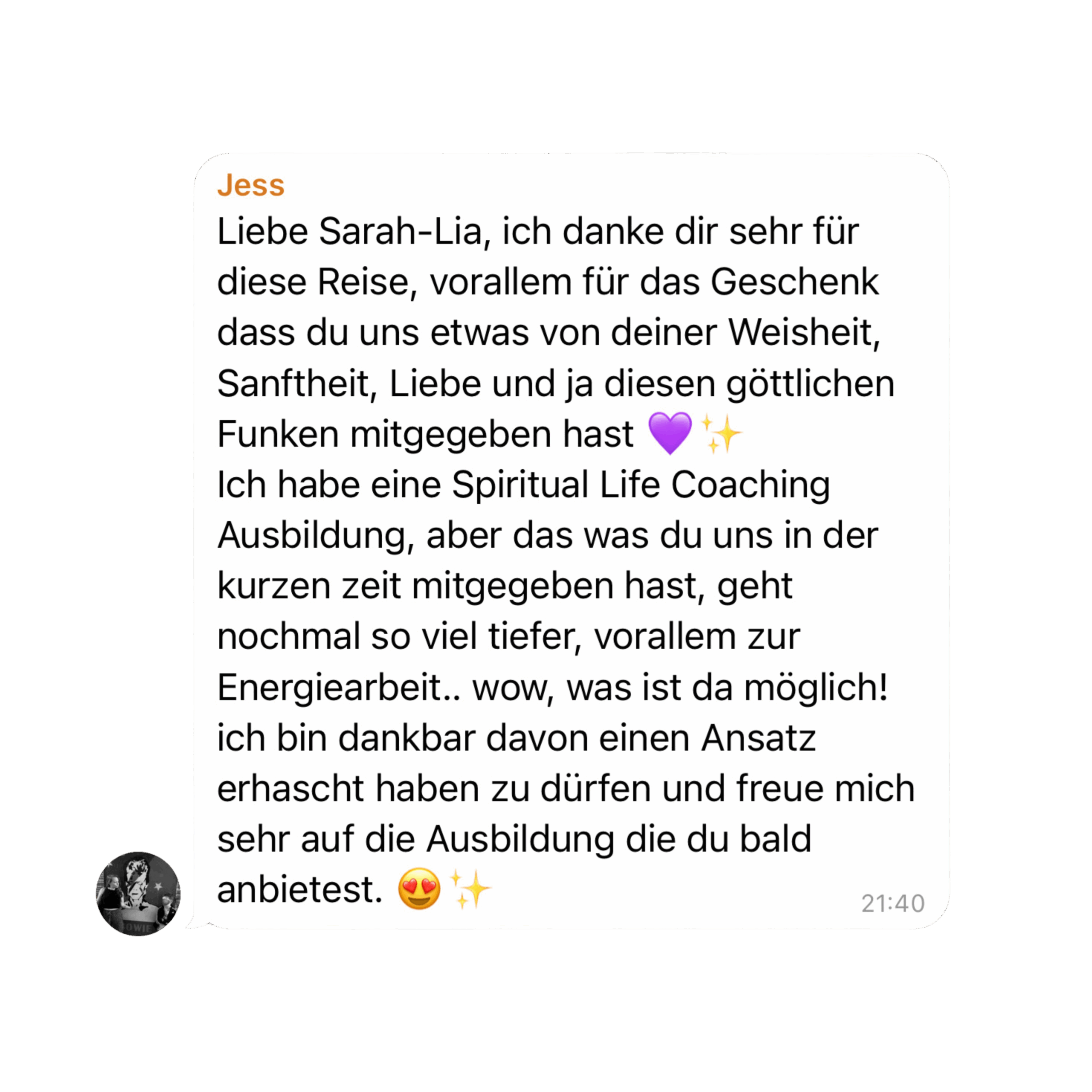Sie sind kein Muss aber helfen dir, deine Frequenz zu halten und im Alltag zu verankern. - Exklusive Telegram-Gruppe: Ein sicherer Raum für Austausch, tägliche Impulse, Unterstützung und gemeinsames Erinnern. Ein Raum der dich in deiner Wandlung hält, trägt und sieht.