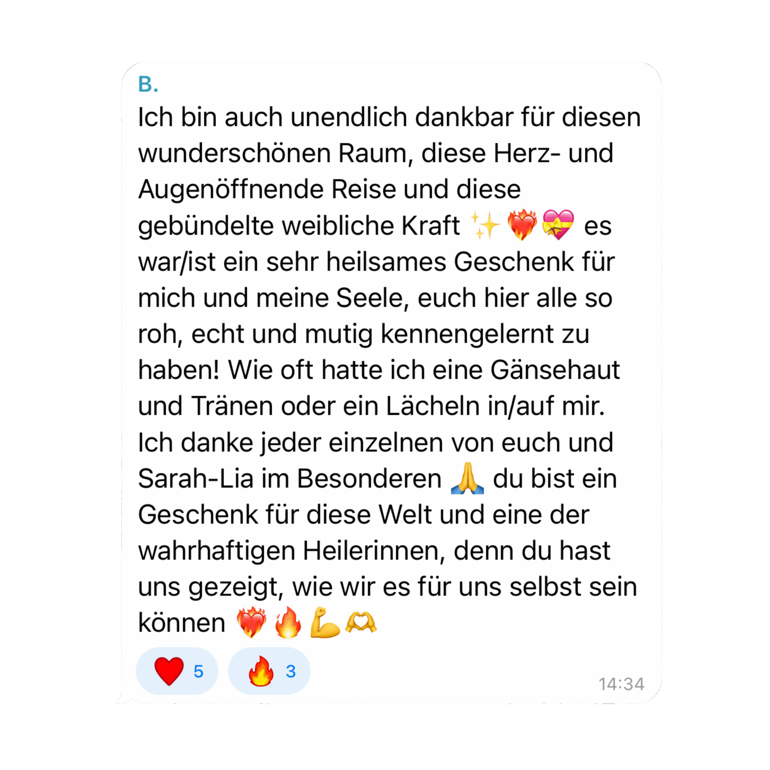 Während der gesamten Reise bist du Teil einer geschlossenen Telegram-Gruppe. Hier fließen regelmäßige Impulse, Übungen, Audios und Austausch. Die Gruppe ist ein lebendiges Feld aus Tiefe, Verbindung und gelebter Frequenz. Du bewegst dich in deinem eigenen Rhythmus, getragen im Kreis von Seelen, die sich erinnern.