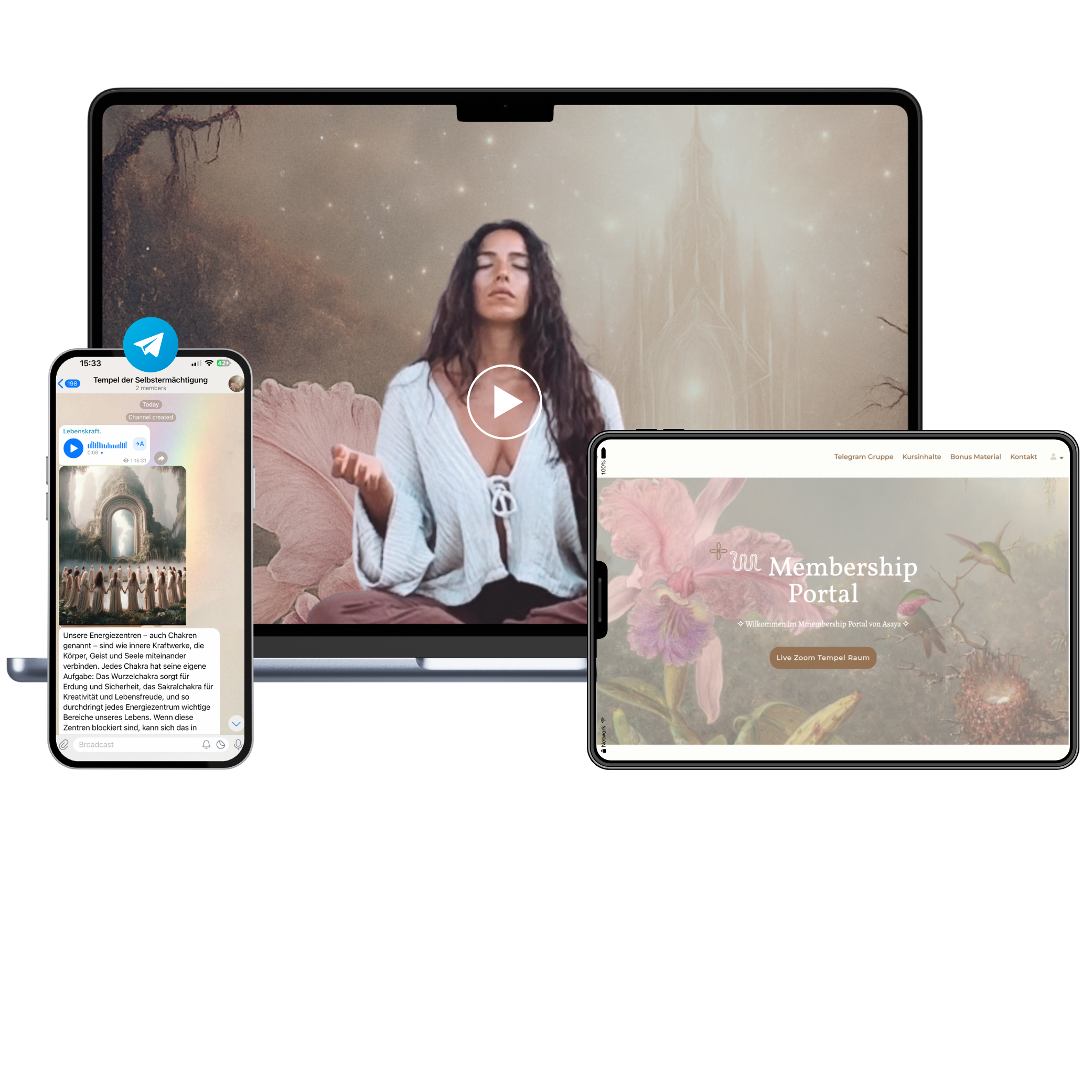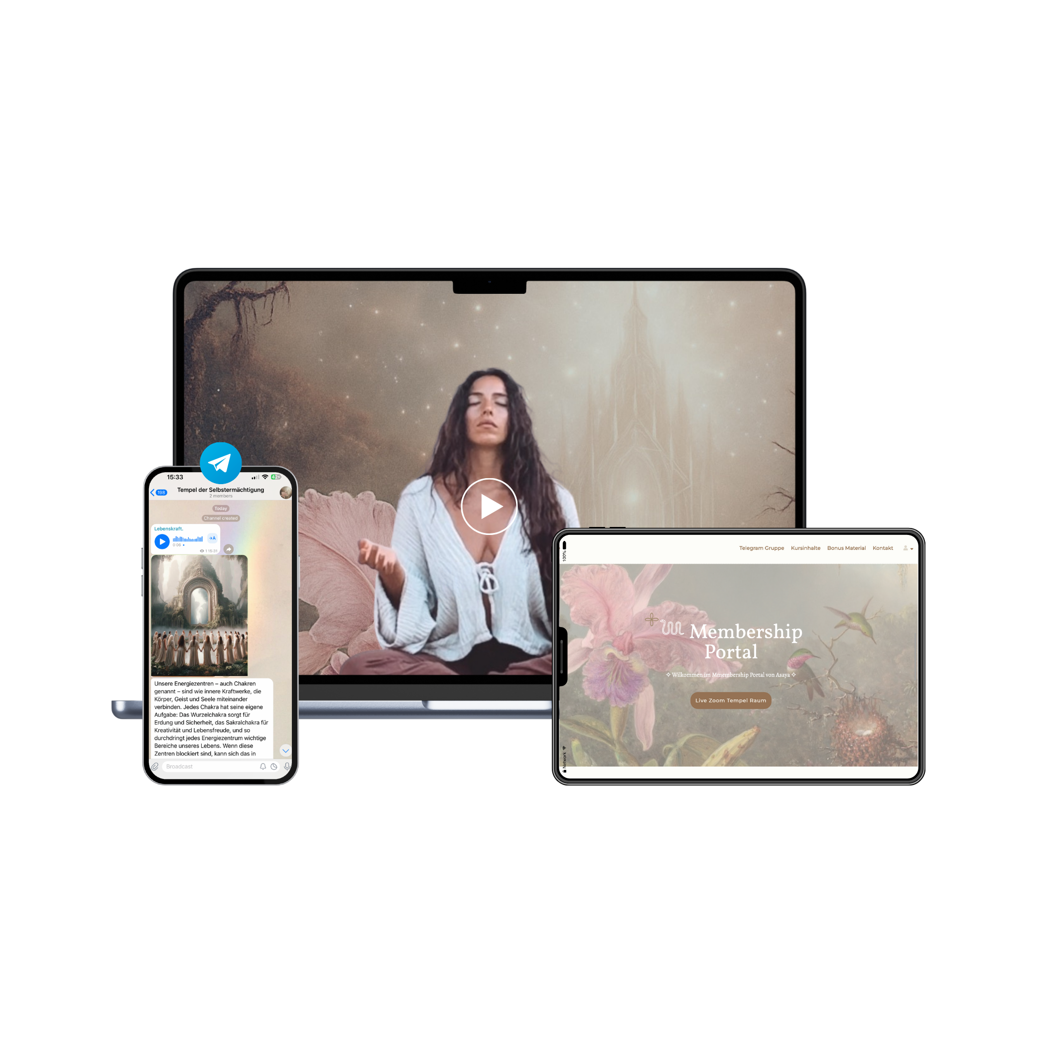 Wir kommen drei Mal im Monat im online live Tempel-Raum zusammen. Jede Session ist ein Portal. Ein Erinnern. Ein tiefes Eintauchen in dich selbst. Du kannst live dabei sein oder die Aufzeichnung im Membership-Bereich anschauen, wann immer du bereit bist.